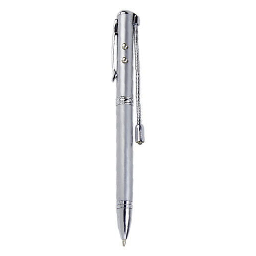Descripción: BOLíGRAFO LáSER LáMPARA (Bolígrafo con lámpara, luz y láser. Mecanismo twist. Incluye estuche metálico y baterías de repuesto.)