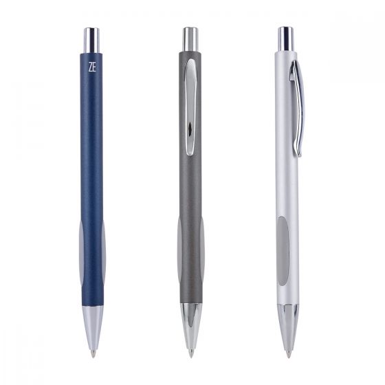 Bolígrafo con grip antiderrapante en los costados. Mecanismo pulsador. Incluye estuche.