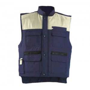 CHALECO DE DOS COLORES. NYLON Y POLIESTER CON DOS COLORES, BOTONES AL FRENTE, BOLSAS AL FRENTE CON CIERRE Y VELCRO. METODO: SERIGRAFIA / BORDADO
