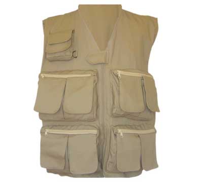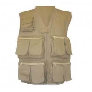 CHALECO DE REPORTERO. NYLON Y POLIESTER CON UN COLOR, VARIAS BOLSAS AL FRENTE.