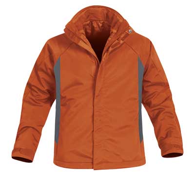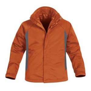 CHAMARRA CON VIVOS. NYLON Y POLIESTER CON DOS COLORES, CON CIERRE Y VELCRO AL FRENTE.