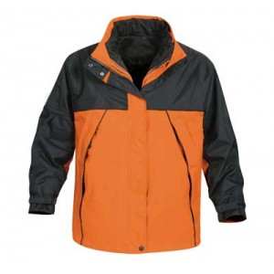 CHAMARRA CON DOS COLORES. NYLON Y POLIESTER, CIERRE Y BOTONES AL FRENTE