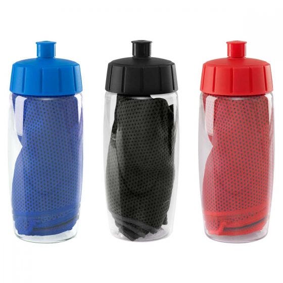 Kit de cilindro con válvula de seguridad y rosca twist-off con toalla de sistema de enfriamiento instantáneo al contacto con el agua. El cilindro y la toalla se entregan por separado para su impresión.