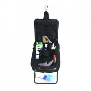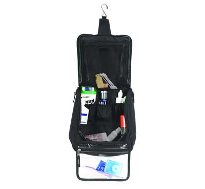 COSMETIQUERA CON GANCHO Y COMPARTIMENTOS NYLON Y POLIESTER CON UN COLOR, TAPA CON CIERRE, GANCHO EN LA TAPA, COMPARTIMENTOS INTERIORES PLASTICO INTERIOR.