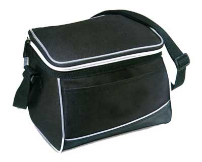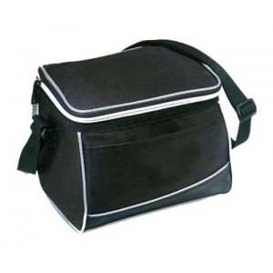 HIELERA SIX PACK NYLON Y POLIESTER CON UN COLOR, CON VIVOS, BOLSA FRONTAL Y CINTA.