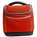 LONCHERA CON AGARRADERA DE PLASTICO NYLON Y POLIESTER CON UN COLOR, AGARRADERA CON PLASTICO, BOLSA FRONTAL, TAPA CON CIERRE.