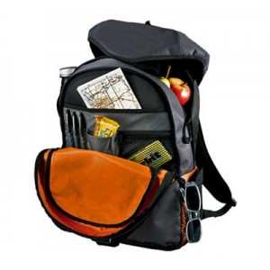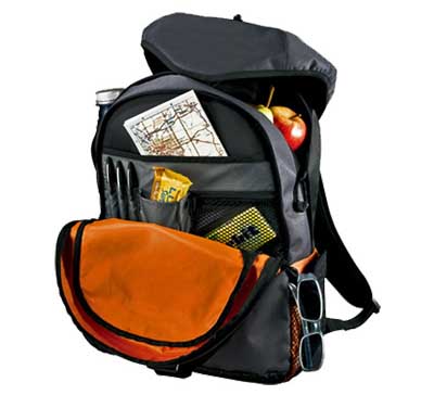 MOCHILA NYLON Y POLIESTER CON UN COLOR, CON VIVOS LATERALES, BOLSA FRONTAL GRANDE CON VARIOS COMPARTIMENTOS, BOLSA LATERAL DE MALLA Y BOLSA LATERAL PARA BEBIDA.
