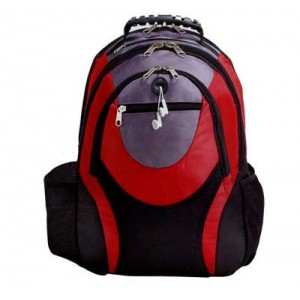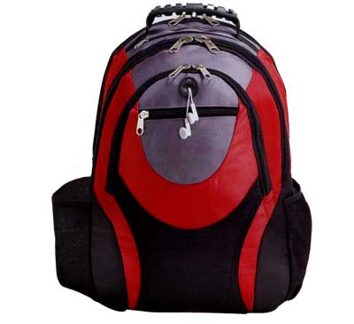 MOCHILA NYLON Y POLIESTER CON TRES COLORES, AGARRADERA DE PLASTICO, TRES BOLSAS FRONTALES GRANDES CON CIERRE Y SALIDA PARA AUDIFONOS, BOLSA LATERAL CON CIERRE Y BOLSA LATERAL DE MALLA.