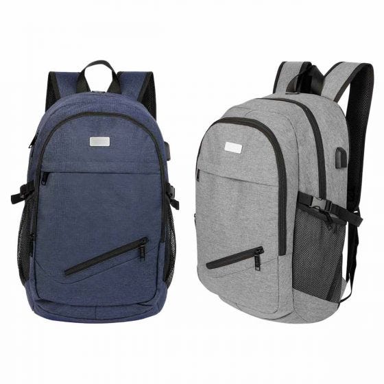 Mochila con salida USB (se requiere conectar a batería portátil) para cargar smartphone. Bolsa principal con espacio para laptop y tablet. 1 Bolsa frontal con organizador y 2 bolsas frontales con cierre. 2 Bolsas laterales de red con broches ajustables de plástico. Salida para audífonos. Aditamento especial trasero para poner en trolley. Placa metálica removible para fácil grabado. Espalda y tirantes acojinados.