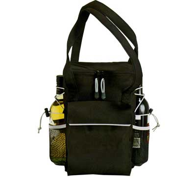 MOCHILA NYLON Y POLIESTER CON UN COLOR, CON AGARRADERAS TIPO BOLSA, CIERRE SUPERIOR Y BOLSAS LATERALES PARA BOTELLAS DE VINO.