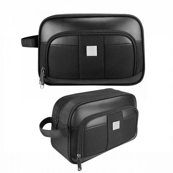 Neceser con cierre y asa en el exterior. Incluye compartimento frontal con doble cierre. Placa metálica removible para fácil grabado.