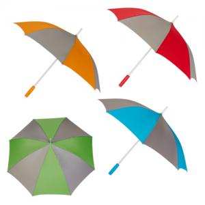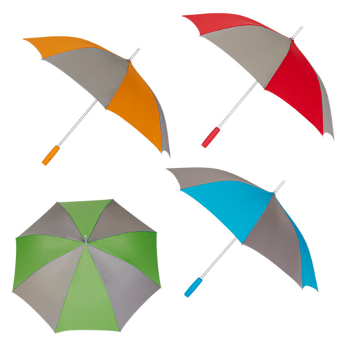 Descripción: PARAGUAS LEYRA (Automático. 8 Paneles y mango de plástico. Estructura en colores metalizados. Incluye funda con agarradera.)