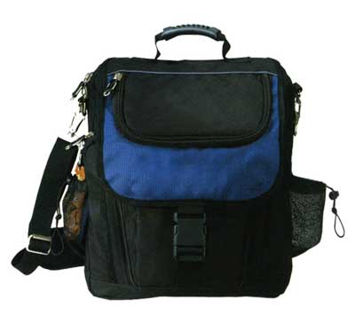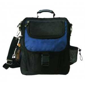 PORTAFOLIO NYLON Y POLIESTER CON DOS COLORES, AGARRADERA CON PLASTICO,CIERRE SUPERIOR, BOLSA DELANTERA CON TAPA Y BROCHE, BOLSA SUPERIOR CON CIERRE, BOLSAS LATERALES CON MALLA.
