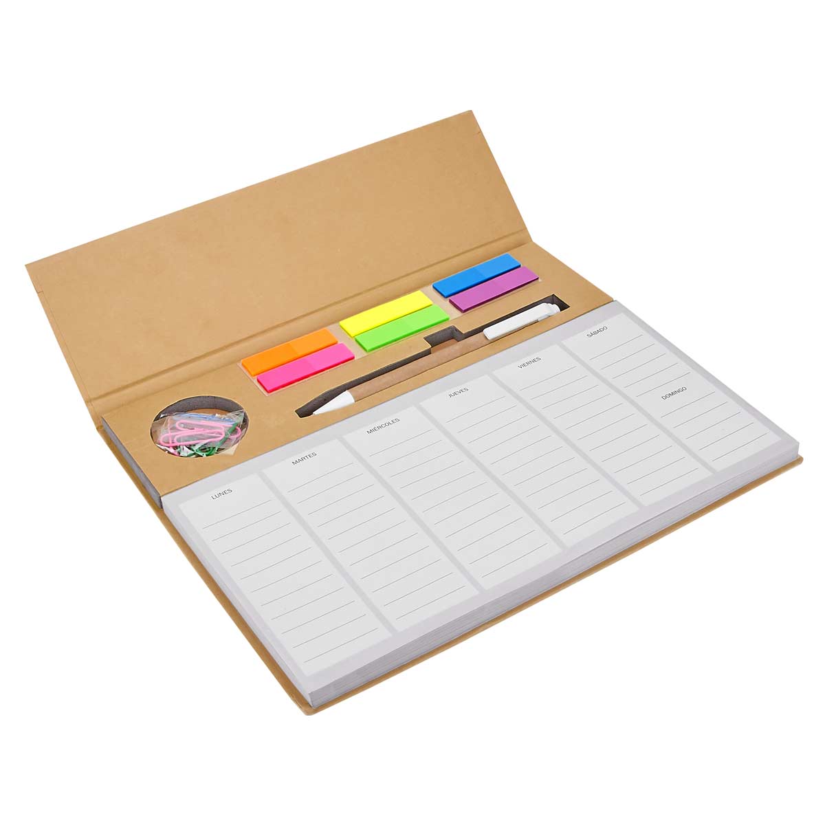 | Descripción: PROGRAMADOR PRISTINA (Programador semanal con 100 hojas. Incluye bolígrafo ecológico, clips y banderillas adheribles de 6 colores.) |