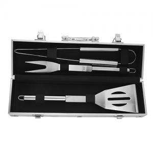 Descripción: SET BBQ SNAZZY (Incluye pinzas, espátula, tenedor para BBQ y estuche metálico.)