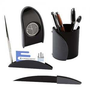 Descripción: SET DE ESCRITORIO JACKSON (Incluye tarjetero con bolígrafo, porta plumas, abrecartas, reloj y caja de regalo.)