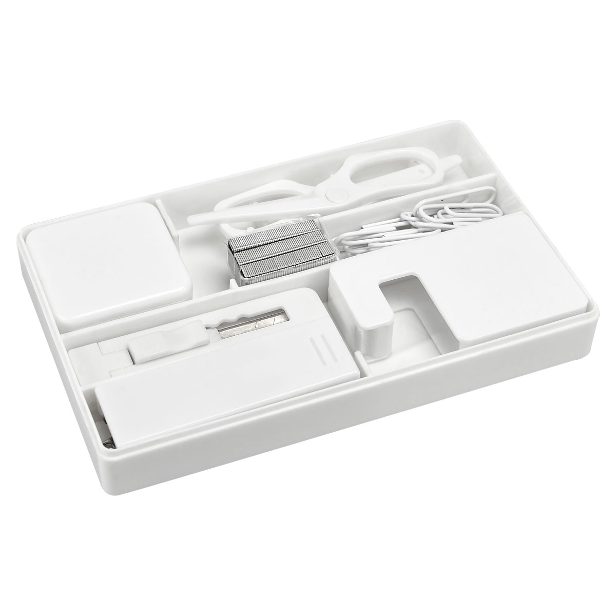 Descripción: SET DE ESCRITORIO KUTNA (Contiene: Engrapadora, cinta métrica de 1.5 m, clips, cuter, despachador de cinta, tijeras y grapas.) |