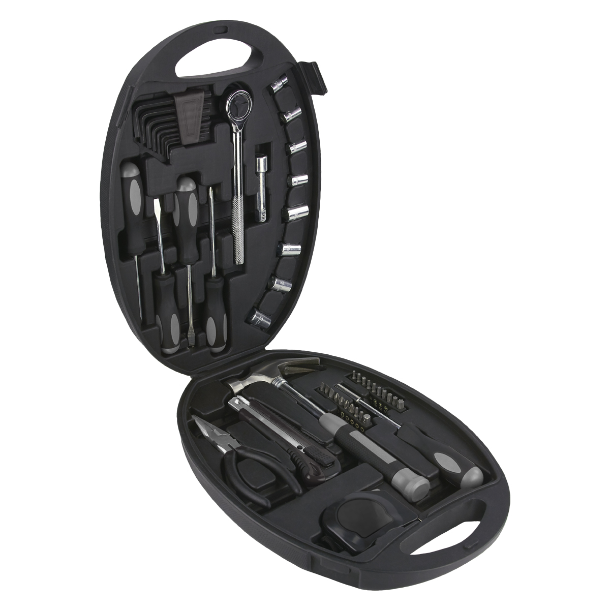 | Descripción: SET DE HERRAMIENTAS BALTIMORE (Contiene 2 desarmadores planos, 2 desarmadores cruz, 8 llaves hexagonales (1.5-6 mm), matraca con adaptador y 8 dados (6-13 mm), martillo, cúter, 1 pinzas de punta/corte, flexómetro 3.5 m, desarmador con adaptador para puntas, 2 juegos de puntas (cruz, plano, torx, cuadrado). Incluye estuche. ) |