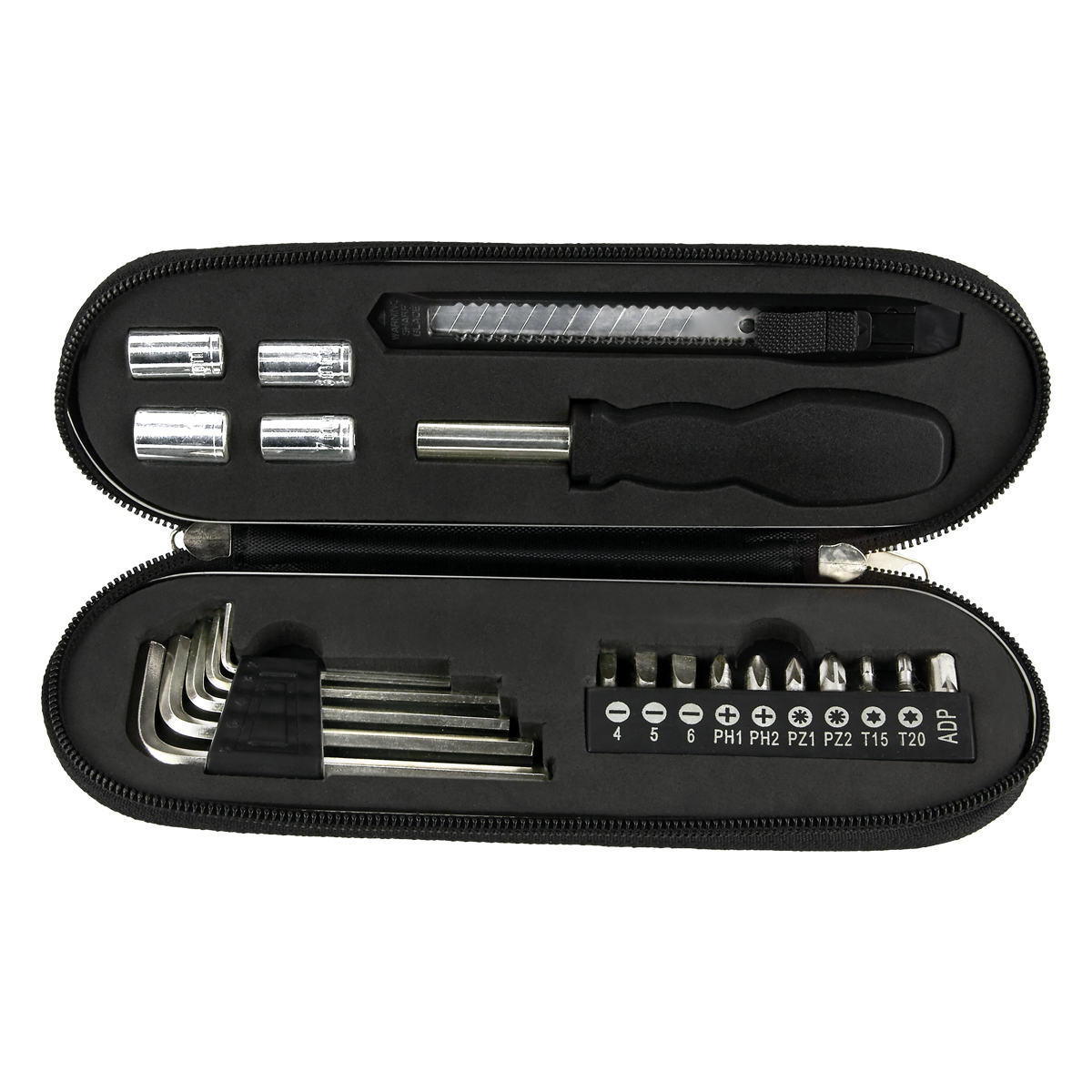 | Descripción: SET DE HERRAMIENTAS LAMPAG (Contiene desarmador, 4 dados, 10 puntas para desarmador, cúter y 5 llaves hexagonales. Incluye estuche.) |