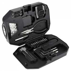 Descripción: SET DE HERRAMIENTAS VALGUS (Contiene pinzas de punta, lámpara desmontable de 13 LEDS (3 pilas AAA no incluidas), flexómetro 1m, correa ajustable con adaptador para lámpara, 2 desarmadores relojero, dado extensión, desarmador, 10 puntas para desarmador, 3 llaves hexagonales y cúter.)