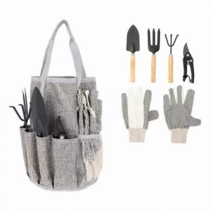 Incluye pinzas de corte, pala ancha, horqueta y rastrillo. Guantes de algodón con antiderrapante. Bolsa de poliéster.
