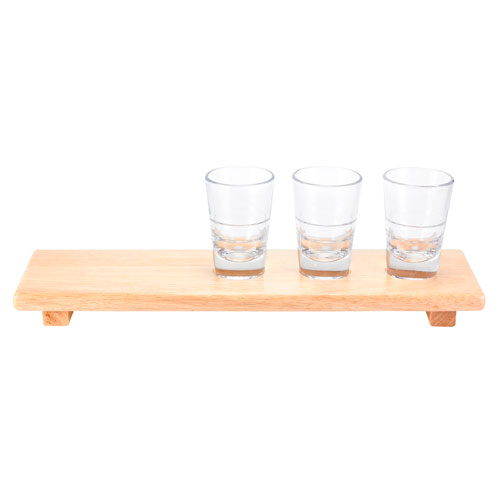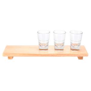 Descripción: TABLA RAUMA (Tabla de madera con 3 vasos de cristal de 2oz.) |