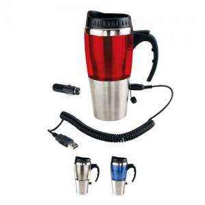 Descripción: TERMO HEAT CON USB (Doble pared. Fuente corriente, adaptador para automóvil y USB, mantiene la temperatura de las bebidas, no calienta. Incluye válvula de seguridad.)